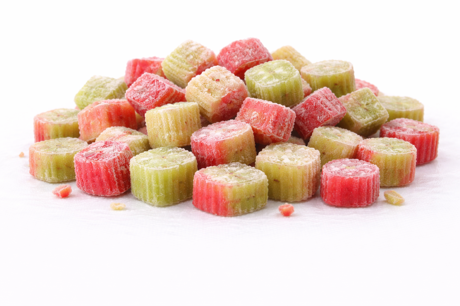Rhubarb sticks are delivered fresh to the factory, each load is quality assurance sampled for foreign material and physical defects. The load is then put in a chill store (3°C) before washing, cutting, inspection and freezing to -18°C or below.